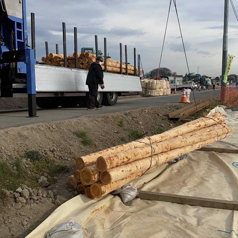 埼玉県久喜市 生松丸太杭 配達納品 土木用木材 2021.03.05 埼玉県久喜市まで生松丸太杭の配達納品です生松丸太杭 5000㎜×150㎜ 栄和林業では草刈作業・雑草搬出・土木資材の加工・現場までの納品も承っております。お見積りは無料です。お気軽にお問い合わせください。