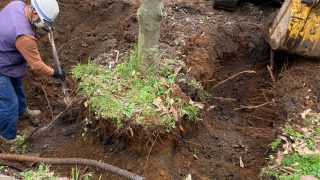 橋の耐震補強工事で障害となる樹木は伐採しましたが、環境保護団体から希少種は伐採せず保存するために移植の要請に伴う工事です。